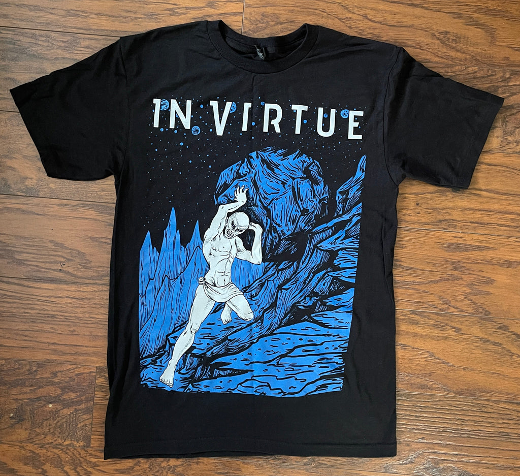 Ever feel like you've been just pushing a rock up a hill all day? Sisyphus understands you. Push that rock with a friend with this slick In Virtue shirt, shipped directly from us to you. Quantities are very limited, so grab one quick before the boulder rolls back down the hill again!
